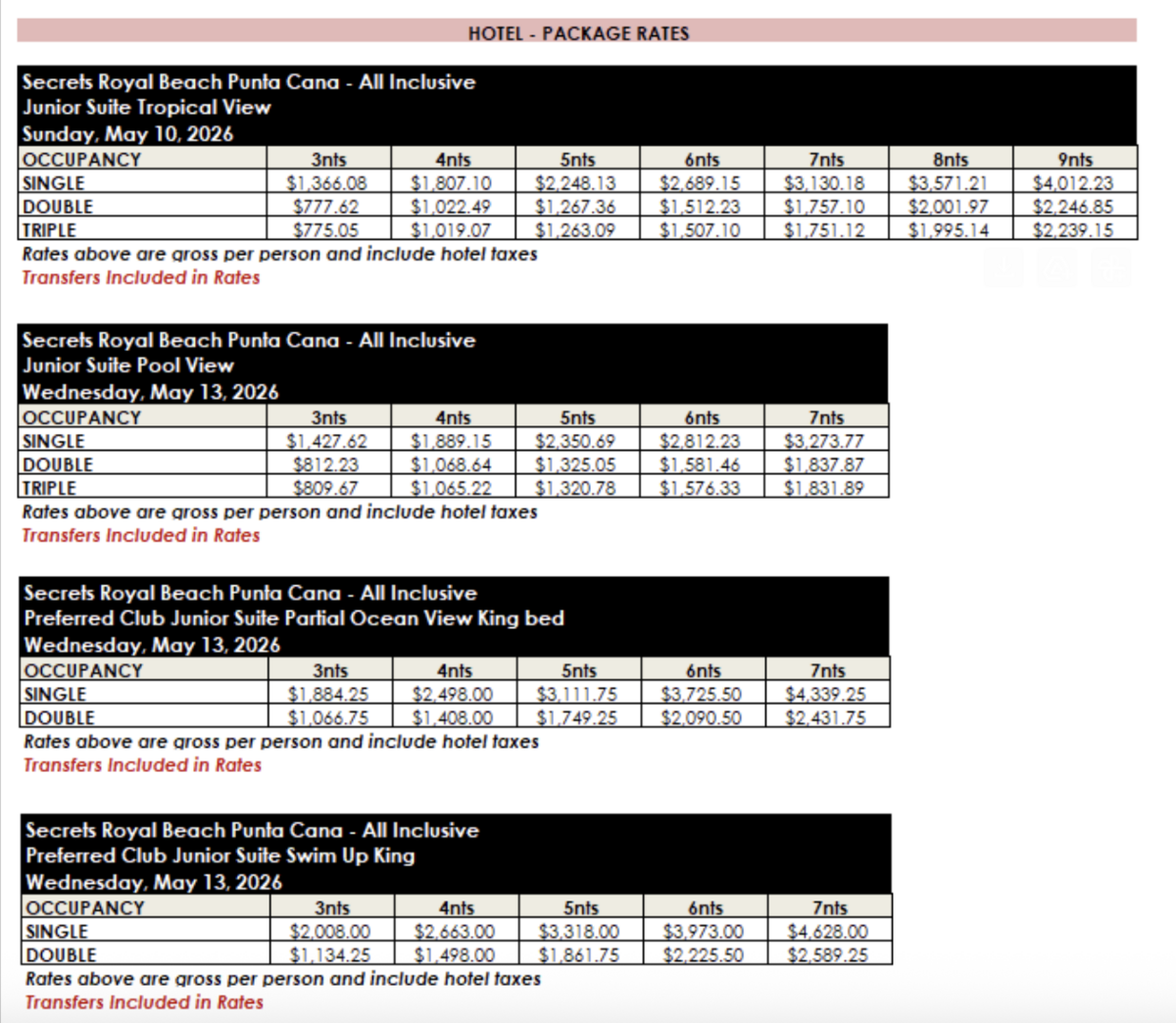 ROOM RATES FOR SECRETS ROYAL BEACH