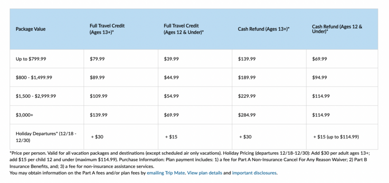 • IMPORTANT: This comprehensive travel protection plan provides the enrolled client with three different refund options minus the costs of the insurance – 1) Travel Credit, 2) Cash Refund (original form of payment). Pricing ranges from $69.99 to $329.99 per person depending on the costs of your package.
